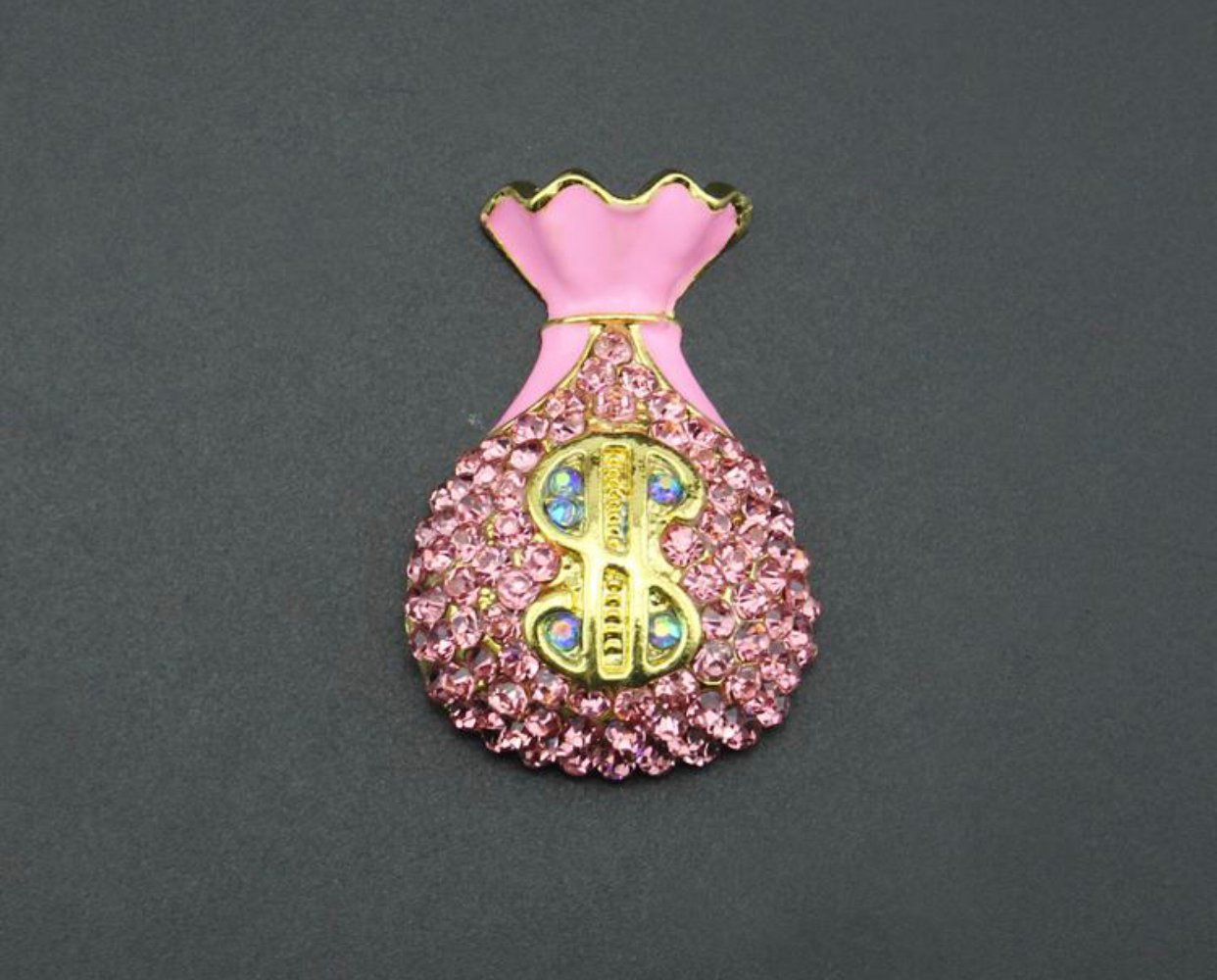 Pink Gold Tone Money Bag Brooch Pin With Crystal Rhinestones