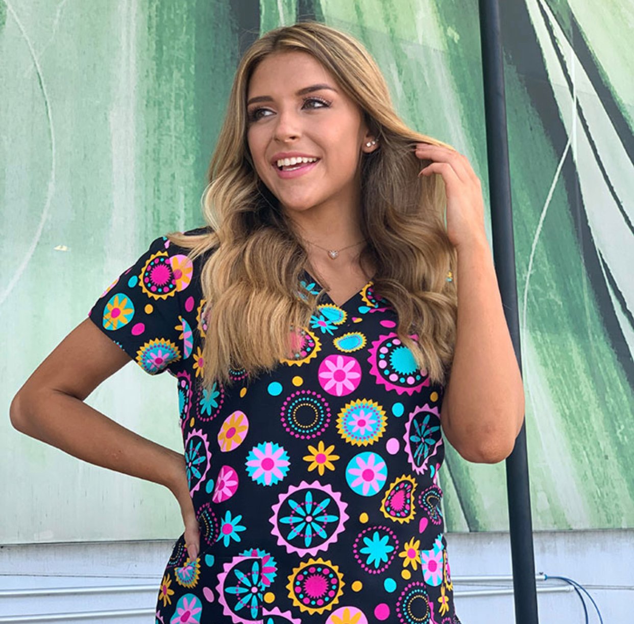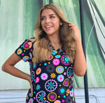 This MERRY GO ROUND print scrub top features two front patch pockets and has set-in sleeves. If you like bright colors this is the perfect top to add to your scrub collection! This cool top has plenty of colors to match up with your favorite style pants.